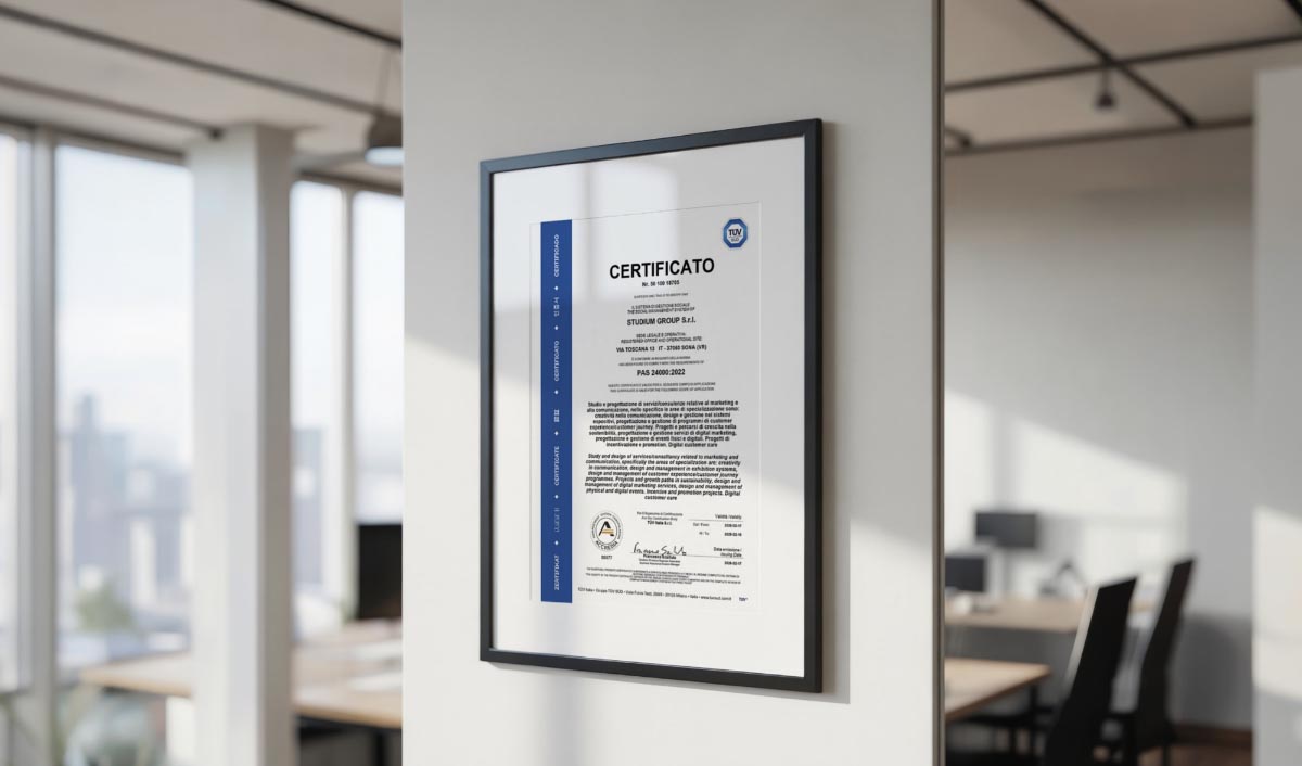 La certificazione PAS 24000 riconosce il raggiungimento da parte di Studium di undici obiettivi di responsabilità sociale, sicurezza e ambiente: